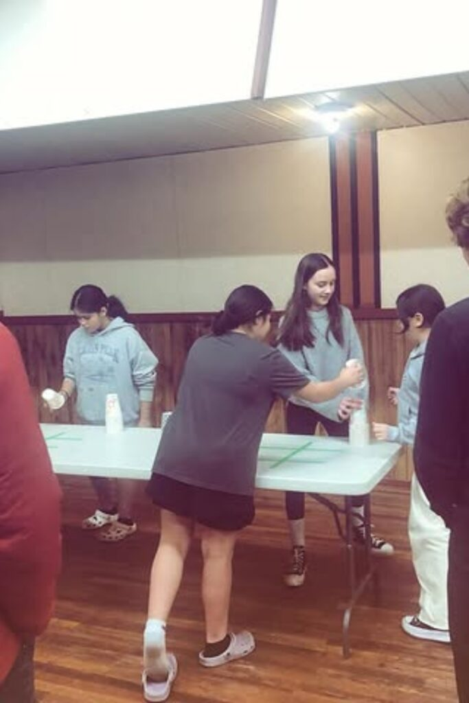Teams line up at a table covered with plastic cups. They race to build a pyramid by stacking the cups and then unstacking them.
