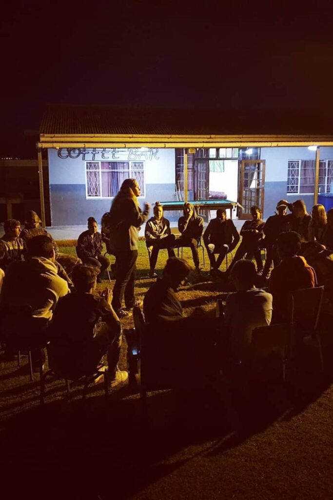 The group sits in a circle outside when it is dark. One person leads with a story or a thoughtful question.