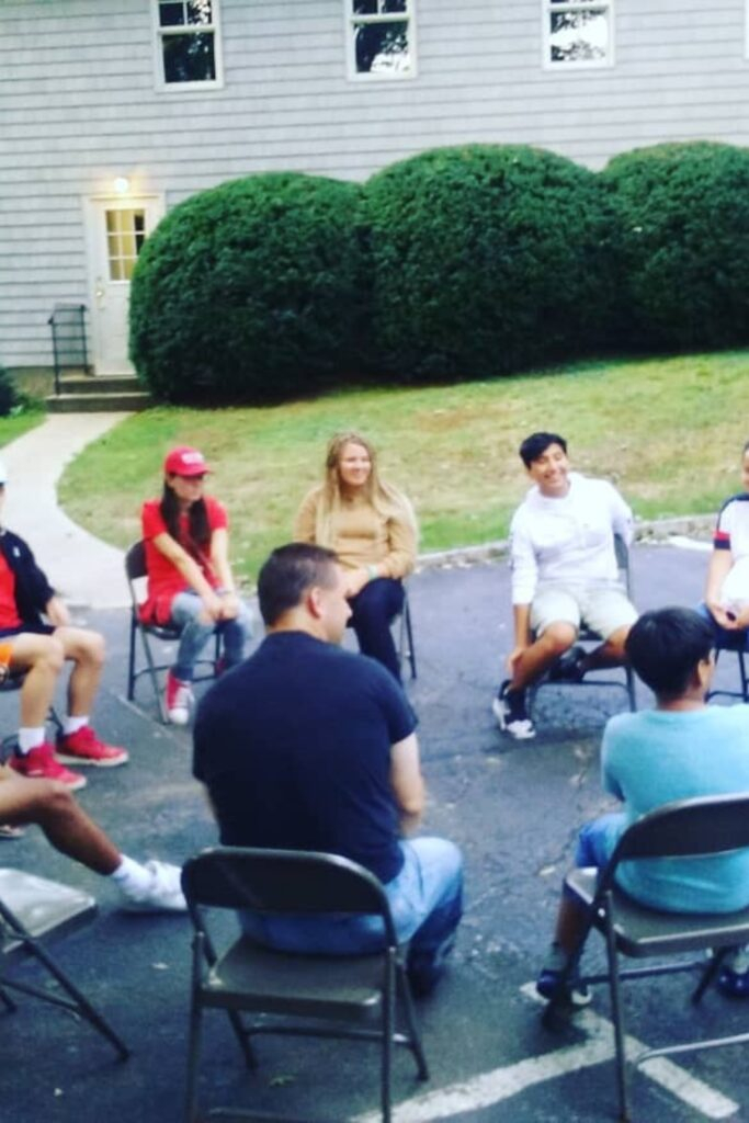 The group sits in a circle outside for a guided discussion. A leader asks open-ended questions to get people talking.